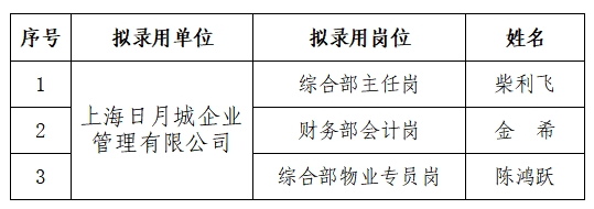 根据三明市文化旅游建设发展集团有限公司关于公开招聘工作人员的公告(2025年2月25日发布),通过报名、资格审查、面试等程序,现将上海日月城企业管理有限公司拟录用人员公示如下: